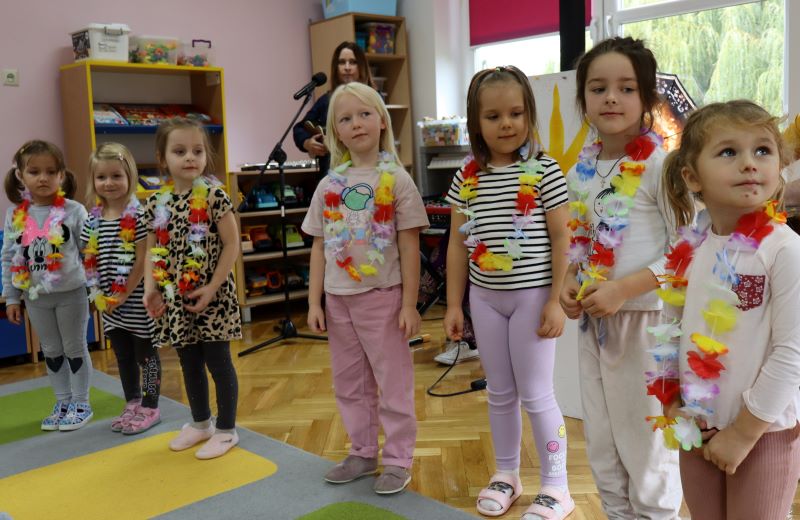 Dziś w naszym przedszkolu była grupa muzyczna z Arte-Muza z Białegostoku z audycją muzyczną ” W stronę słońca”. Wraz z artystami przenieśliśmy się z zimnej i deszczowej Deszczownicy – małego miasteczka na Podlasiu – w daleką podróż do ciepłych, słonecznych krajów, gdzie zawsze świeci słońce, a muzyka rozbrzmiewa radością i energią. Podczas tej barwnej wyprawy dzieci odwiedziły Kubę, Hawaje, Brazylię i Jamajkę, poznając tamtejsze rytmy, instrumenty i zwyczaje. Przedszkolaki tańczyły lambadę, próbowały swoich sił w tańcu hula, śpiewały piosenki w rytmie rumby i reggae, a przede wszystkim świetnie się bawiły! Występ był pełen śmiechu, ruchu i wspólnego muzykowania – wszyscy mogli poczuć ciepło tropikalnych rytmów i radość płynącą z muzyki.